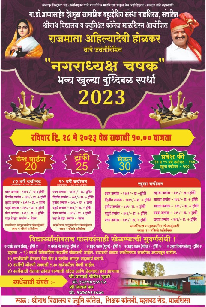 पुण्यश्लोक राजमाता अहिल्यादेवी होळकर यांच्या जयंतीनिमित्त माळशिरस नगरपंचायतीचे नगराध्यक्ष .डॉ.आप्पासाहेब देशमुख यांच्या नावे श्रीनाथ विद्यालय व ज्युनियर कॉलेज माळशिरस यांचे वतीने भव्य राज्यस्तरीय नगराध्यक्ष बुद्धिबळ चषकचे आयोजन दिनांक 28 मे रोजी करण्यात आले आहे.