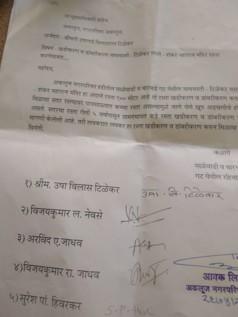 अकलूज नगर परिषद हद्दीतील जाधव वस्ती ,टिळेकर वस्ती ते शंकर महाराज मंदिर रस्ता खडीकरण व डांबरीकरण करण्याची मागणी उषाताई विलासराव टिळेकर आणि अन्य पाच जणांनी निवेदनाद्वारे अकलूज नगर परिषदेचे मुख्याधिकारी दयानंद गोरे यांच्याकडे केली आहे