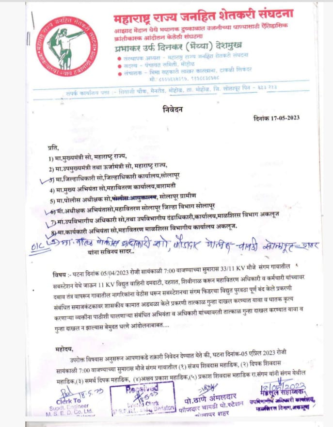 जनहित शेतकरी संघटनेचे सोलापूर महावितरण कार्यालयासमोर संगम ता.माळशिरस महावितरण अधिकाऱ्यांच्या विरोधात 29 मे पासुन बेमुदत धरणे आंदोलन