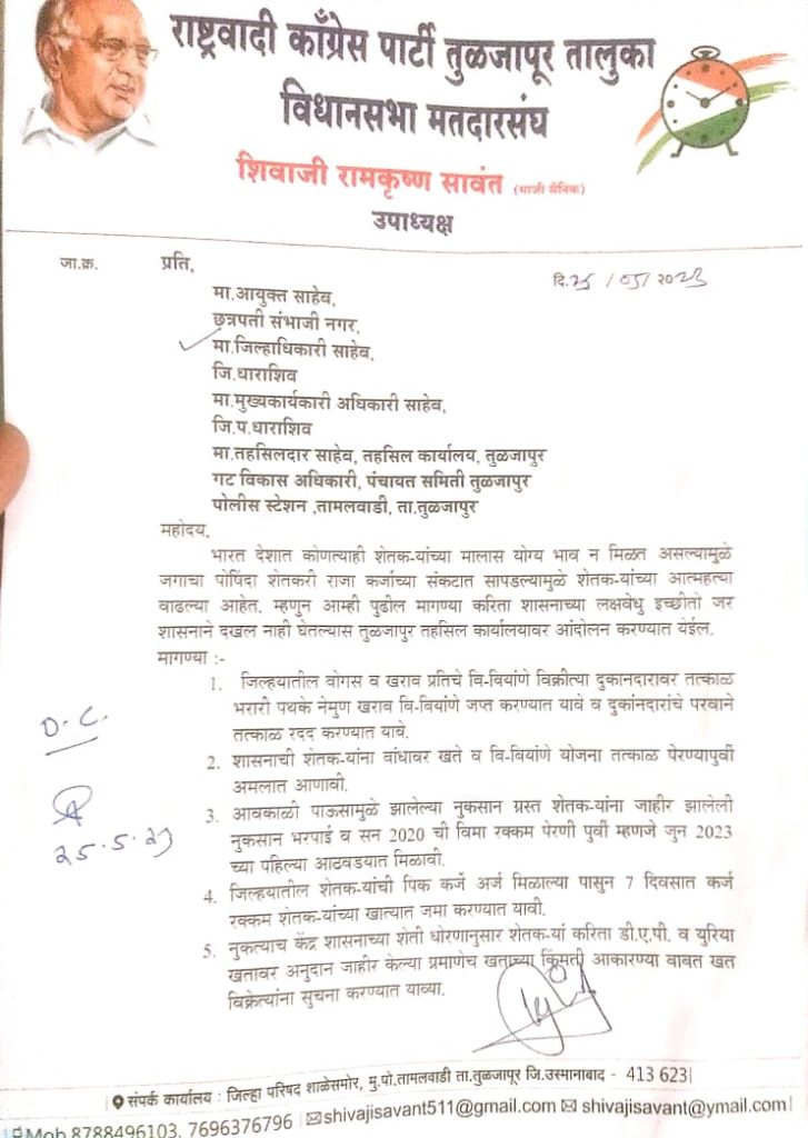 महाराष्ट्रात अवकाळी पावसाने थैमान घातल्यामुळे जगाचा पोशिंदा शेतकरी राजा आर्थिक संकटात सापडला आहे या संकटात सापडलेले शेतकरी राजाला दिलासा मिळावा यासाठी राष्ट्रवादी काँग्रेसचे तुळजापूर विधानसभा उपाध्यक्ष श्री सावंत यांच्या वतीने जिल्ह्यातील बोगस व खराब प्रतीचे बियाणे विक्री करणाऱ्या दुकानदारावर धाडी मारून बोगस बियाणे जप्त करावी, बी-बियाणे शेतकऱ्याच्या बांधावर वाटप योजना तत्काळ अमलात आणावी,