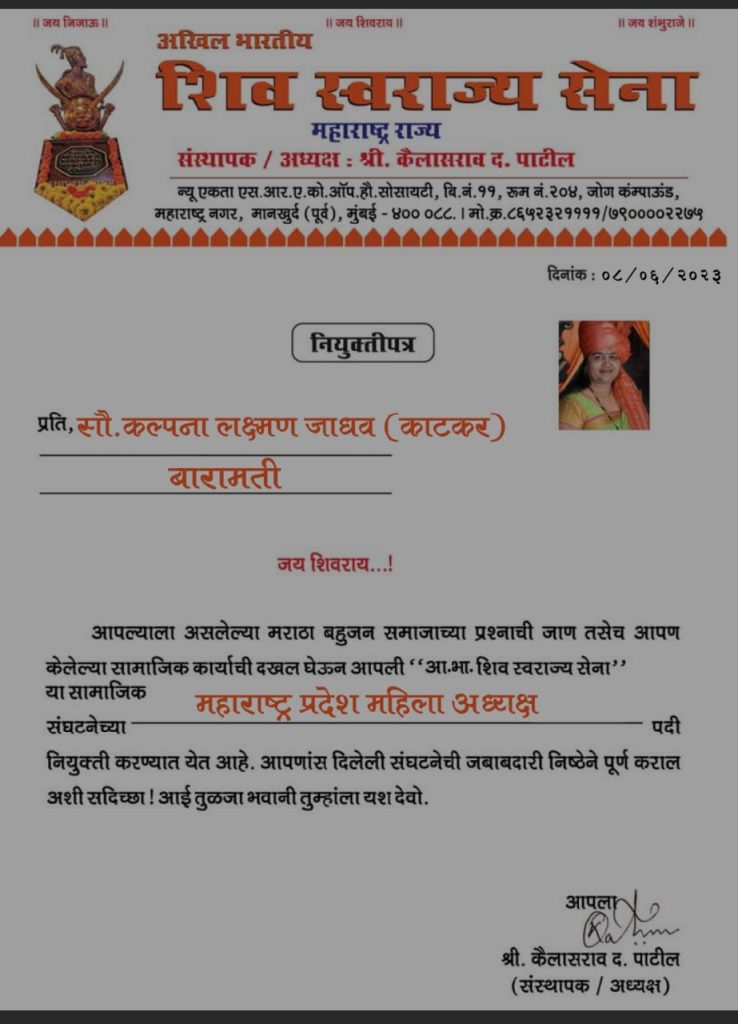 बारामती येथील सामाजिक कार्यकर्त्या व बारामती तालुका शिवसेना महिला आघाडीच्या संघटक ,कल्पनाताई जाधव (काटकर) यांची “अखिल भारतीय शिवस्वराज्य सेने “च्या महाराष्ट्र प्रदेश महिला-अध्यक्ष पदी निवड केल्याचे पत्र संस्थापक/ अध्यक्ष कैलास पाटील मुंबई यांनी निवड केल्याचे नियुक्तीपत्र देण्यात आहे.