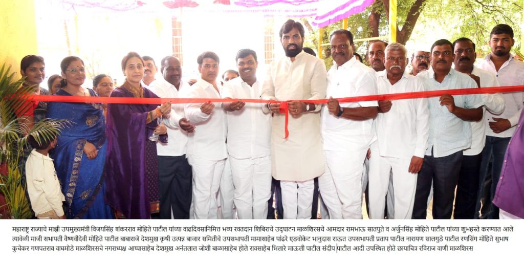 महाराष्ट्र राज्याचे माजी उपमुख्यमंत्री विजयसिंह मोहिते पाटील यांच्या वाढदिवसानिमित्त शिवामृत भवन, सदाशिवनगर येथे भव्य "रक्तदान शिबिराचे" आयोजन करण्यात आले. याप्रसंगी कै.सहकार महर्षी शंकरराव मोहिते पाटील (काकासाहेब) व कै. रत्नप्रभादेवी शंकरराव मोहिते पाटील (अक्कासाहेब ) यांच्या प्रतिमेचे पूजन करून व शिबिराचे उदघाटन विधानसभा आमदार राम सातपुते यांचे शुभहस्ते करण्यात आले तसेच याप्रसंगी माजी जि प उपाध्यक्ष बाबाराजे देशमुख, सत्यप्रभादेवी मोहिते पाटील, जि प सदस्या स्वरूपाराणी मोहिते पाटील, अरुण तोडकर, जि प सदस्या सुनंदा फुले, मंगलताई वाघमोडे, सुनंदा फुले, संगीताताई मोटे, माजी सभापती वैष्णवीदेवी मोहिते पाटील, माजी उपसभापती अर्जुनसिंह मोहिते पाटील, प्रतापराव पाटील, शंकरराव भानवसे, विश्वतेजसिंह मोहिते पाटील, RPI चे जिल्हाध्यक्ष सोमनाथ भोसले, कृषी उत्पन्न बाजार समितीचे उपसभापती मामासाहेब पांढरे, नगराध्यक्ष डॉ आप्पासाहेब देशमुख, तालुकाध्यक्ष नरेंद्र भोसले, भिलारे भाऊ, ऍड. बी वाय राऊत, गणपतराव वाघमोडे, पं स सदस्य माऊली पाटील, संदीप सावंत, सुभाष कुचेकर, सावता ढोपे, बाळासाहेब होले, कृषी उत्पन्न बाजार समितीचे संचालक आप्पासाहेब रूपनवर, संदीप पाटील, शिवामृतचे संचालक अरविंद भोसले, लक्ष्मण पवार, शरद साळुंखे, अनंतलाल दोशी, माऊली सूळ, नारायण सालगुडे, कृषी उत्पन्न बाजार समिती संचालक, सहकार महर्षी कारखान्याचे संचालक, तसेच प्राथमिक आरोग्य केंद्र पुरंदावडे चे अधिकारी सोनाली परतवार व सर्व स्टाफ, तसेच अक्षय ब्लॅक बँक चे चेअरमन संजयकुमार शिंदे व सर्व स्टाफ, सहकार महर्षी शंकरराव मोहिते पाटील ब्लड बँक अकलूज चे सर्व स्टाफ, तसेच यावेळी शिवरत्न वेलफेअर ट्रस्ट, माजी जि प सदस्य, माजी पं स सदस्य, श्री शंकर सहकारी कारखान्याचे संचालक, सर्व सरपंच, उपसरपंच, ग्रामपंचायत सदस्य, सर्व ग्रामस्थ उपस्थित होते.