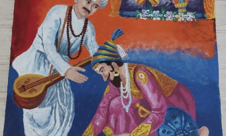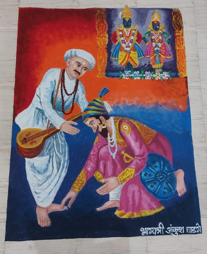 छत्रपती शिवाजी महाराजांच्या संत भेटीचा सोहळा रांगोळी तून भाग्यश्री घाडगे यांनी साकारला