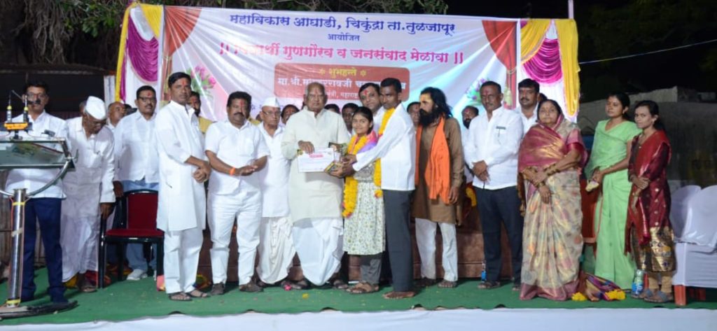 तुळजापूर तालुक्यातील चिकुंद्रा येथे महाविकास आघाडीच्या वतीने आयोजित करण्यात आलेल्या विद्यार्थी गुणगौरव व जनसंवाद मेळाव्याच्या निमित्ताने चिकुंद्रा व पंचक्रोशीतील इयत्ता दहावी व बारावी मध्ये उत्तुंग यश संपादन केलेल्या गुणवंत विद्यार्थ्यांचा मधुकरराव चव्हाण यांच्या हस्ते सत्कार करण्यात आला . यावेळी ते बोलत होते .कार्यक्रमाच्या अध्यक्षस्थानी माजी सरपंच विश्वनाथ मोटे होते तर प्रमुख पाहुणे म्हणून व्यासपीठावर महाराष्ट्र प्रदेश काँग्रेस कमिटीचे सचिव सुनील चव्हाण , जिल्हा काँग्रेस कमिटीचे अध्यक्ष , ॲड, धीरज पाटील , माजी जि . प. सभापती मुकुंद डोंगरे ,शिवसेना माजी उपजिल्हाप्रमुख शाम पवार .कमलाकर चव्हाण , ,जि .प . सदस्य प्रकाश चव्हाण,राष्ट्रवादीचे जिल्हा सरचिटणीस महेश कदम , कृषी उत्पन्न बाजार समितीचे संचालक अशोक पाटील , सुनील जाधव , संजय भोसले ,