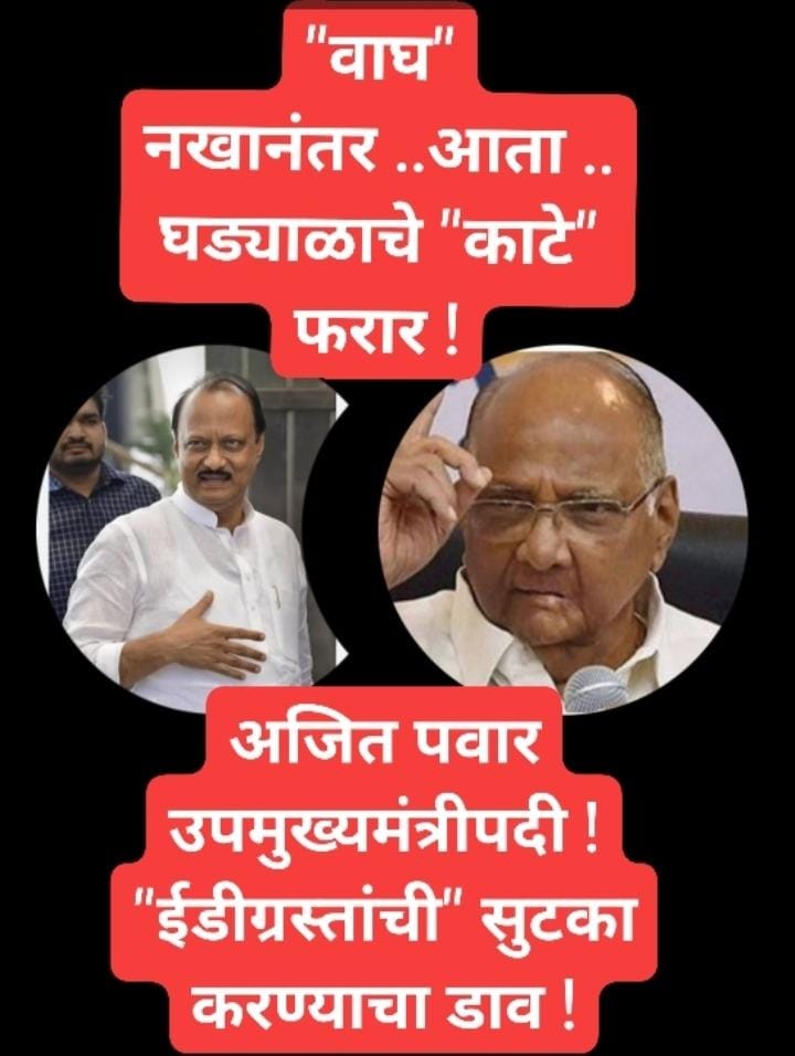 शिवसेनेच्या वाघ नखानंतर आता .. राष्ट्रवादी च्या घड्याळाचे काटे “फरार” झाल्याचे स्पष्ट होत आहे . भविष्यात “महाआघाडी “उध्वस्त” होईल अशी शक्यता नाकारता येत नाही . पडद्यामागील या खेळीचे “गेमचेंजर”हे देवेंद्र फडणवीस “ठरले आहेत. त्यांच्याच “रणनीती” नुसार नुसार एकनाथ शिंदे फुटले ..आणि आज अजित पवारांना देखील त्यांनी आपल्या “गळास” लावले .