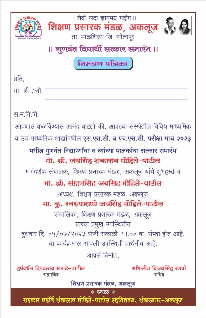 पुणे बोर्डाच्या वतीने मार्च २०२३ मध्ये घेण्यात आलेल्या इयत्ता १० वी व १२वी परीक्षेत यश प्राप्त केलेल्या शिक्षण प्रसारक मंडळातील १९९ गुणवंत विद्यार्थी, विद्यार्थिनी व त्यांच्या पालकांचा सत्कार समारंभ बुधवार दिनांक ५ जुलै २०२३ रोजी सकाळी ११ वाजता स्मृती भवन शंकरनगर येथे संस्थेचे जेष्ठ संचालक जयसिंह मोहिते पाटील यांच्या शुभ हस्ते होणार आहे.