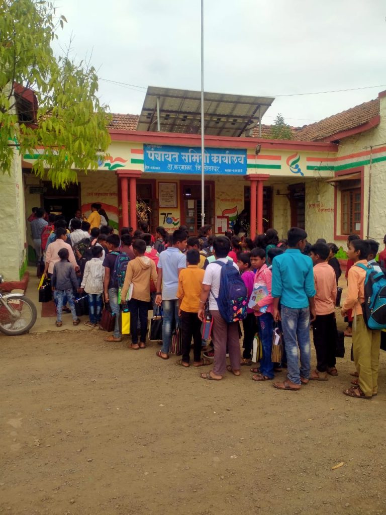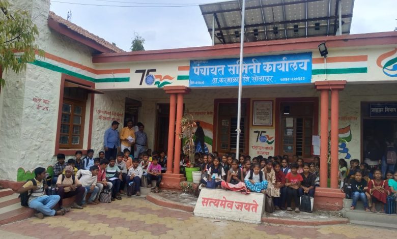 वांगी नंबर एक येथे रिक्त शिक्षक पदे भरण्याकरिता वांगी येथील जिल्हा परिषद येथील विद्यार्थ्यांनी काढला गटविकास अधिकारी कार्यालयावर बेधडक मोर्चा विद्यार्थ्यांनी भरवली चक्क पंचायत समितीच्या आवारातच शाळा