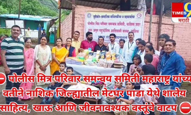 पोलीस मित्रपरिवार समन्वय समिती नाशिक शहर ज्ञात अमृत बहुउद्देशीय आदिवासी संस्था नाशिक यांच्या संयुक्त विद्यमानाने नाशिक जिल्ह्यातील मेटघर येथील गरजूंना रविवार दिनांक 16 जुलै 2023 रोजी जीवनावश्यक वस्तू कपडे व शालेय विद्यार्थ्यांना शालेय साहित्याचे वाटप करण्यात आले