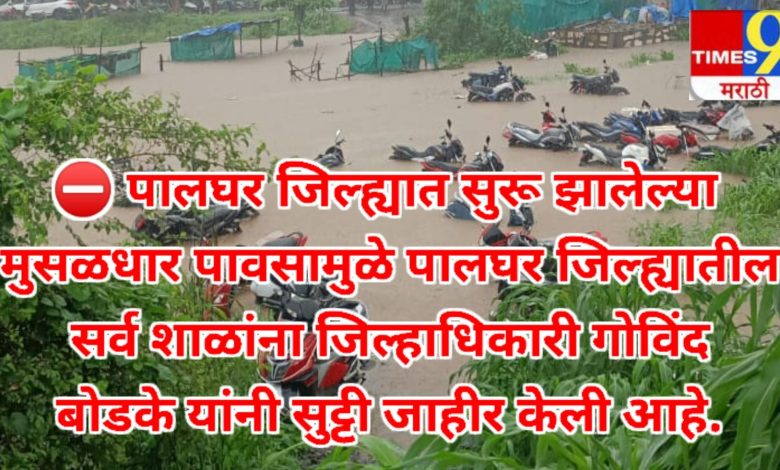 पालघर जिल्ह्यात सुरू झालेल्या मुसळधार पावसामुळे पालघर जिल्ह्यातील शाळांना पालघर जिल्हाधिकारी गोविंद बोडके यांनी केली सुट्टी जाहीर.( फक्त एक दिवस)