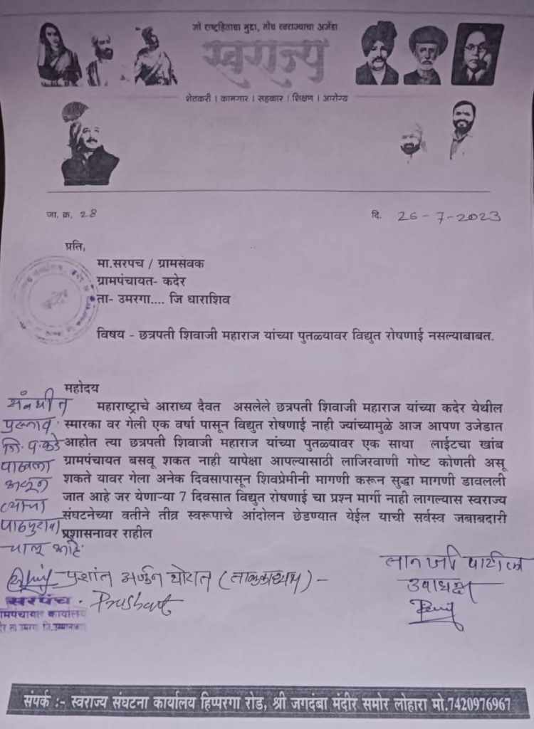 कदेर ता.उमरगा येथील छञपती शिवाजी महाराज चौकात विद्युत लाईट बसवण्याची हिंदवी स्वराज्य संघटनेची मागणी