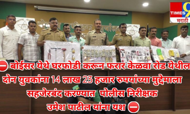 बोईसर येथे घरफोडी करून फरार केळवा रोड येथील दोन युवकांना 14 लाख 23 हजार रुपयांच्या मुद्देमाला सह जेरबंद करण्यात बोईसर पोलीस निरीक्षक उमेश पाटील यांच्या पथकाला यश.