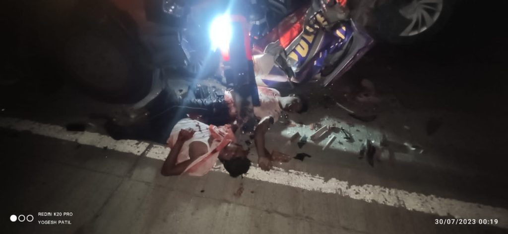 आयशर चालक हा पुर्विच वाहानाच्या पाठीमागे उभा होता त्यास वाहान हायवेवर का थांबवले आहे ही चौकशी करण्यासाठी पोलिस कर्मचारी संजय नेटके हे चालका जवळ जाताच पोलिस व्हॅनच्या पाठीमागून येणाऱ्या आयशर क्रमांक यु पी 63 बी टी 9127 च्या वाहनचालकाने आपल्या ताब्यातील वाहन भरधा वेगाने व निष्काळजीपणानेे चालवून पोलीस व्हॅनला जबर धडक दिली यात पोलिस व्हॅनही समोरील उभ्या असलेल्या आयशरला धडकली असता दोन्ही वाहनाच्या मध्ये उभे असलेले पोलीस कर्मचारी संजय रंगराव नेटके वय 41 वर्ष आणि आयशर चालक पांडुरंग हरी नकाते वय 50 हे दोघेही दोन्ही वाहनाच्या मध्ये दाबून मृत्यू पावले आहेत. तर संतोष देवराव हराळ व कुणाल बबनराव साळवे असे दोघेही गंभीर जखमी झाल्याने त्यांना दवाखान्यामध्ये उपचार करण्याकरता रुग्णालयात दाखल करण्यात आले.