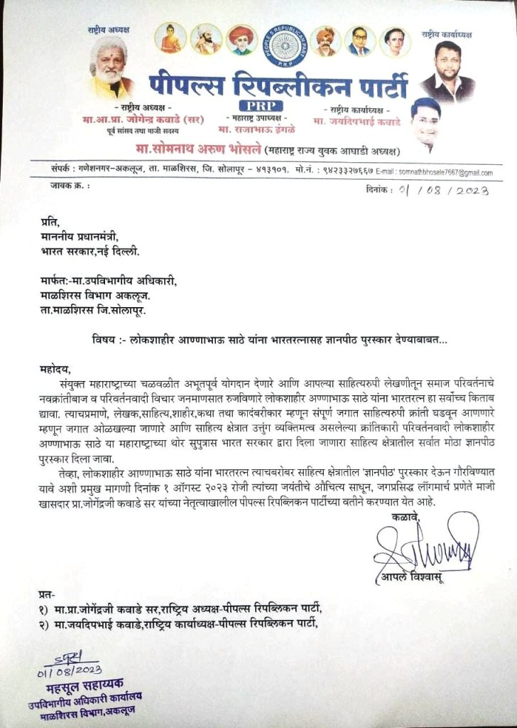 त्यानंतर अकलूजचे उपविभागीय अधिकारी यांचे मार्फत भारताचे पंतप्रधान नरेंद्रजी मोदी साहेब यांना लेखी निवेदनाद्वारे संयुक्त महाराष्ट्राच्या चळवळीत अभूतपूर्व योगदान देणारे आणि आपल्या साहित्यरुपी लेखणीतून समाज परिवर्तनाचे नवक्रांतीबाज व परिवर्तनवादी विचार जनमानसात रुजविणारे लोकशाहीर आण्णाभाऊ साठे यांना १ ऑगस्ट २०२३ रोजी त्यांच्या जयंतीचे औचित्य साधून भारतरत्नासह साहित्य क्षेत्रातील ज्ञानपीठ पुरस्कार देऊन गौरविण्यात यावे अशी मागणी पीपल्स रिपब्लिकन पार्टीचे महाराष्ट्र युवक प्रदेशाध्यक्ष सोमनाथ भोसले यांनी केली आहे सदरचे निवेदन प्रांत कार्यालयाच्या नायब तहसीलदार देसाई मॅडम यांनी स्वीकारले.