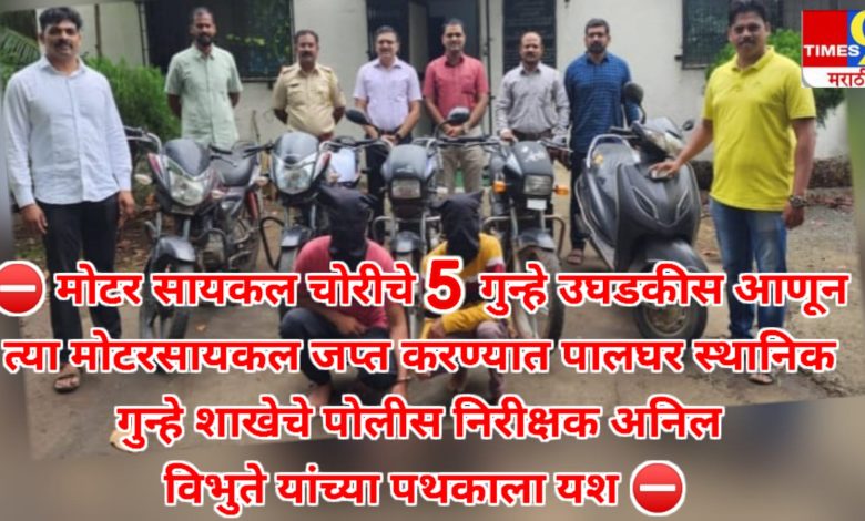 मोटर सायकल चोरीचे 5 गुन्हे उघडकीस आणून त्या मोटरसायकल जप्त करण्यात पालघर स्थानिक गुन्हे शाखेचे पोलीस निरीक्षक अनिल विभुते यांच्या पथकाला यश.