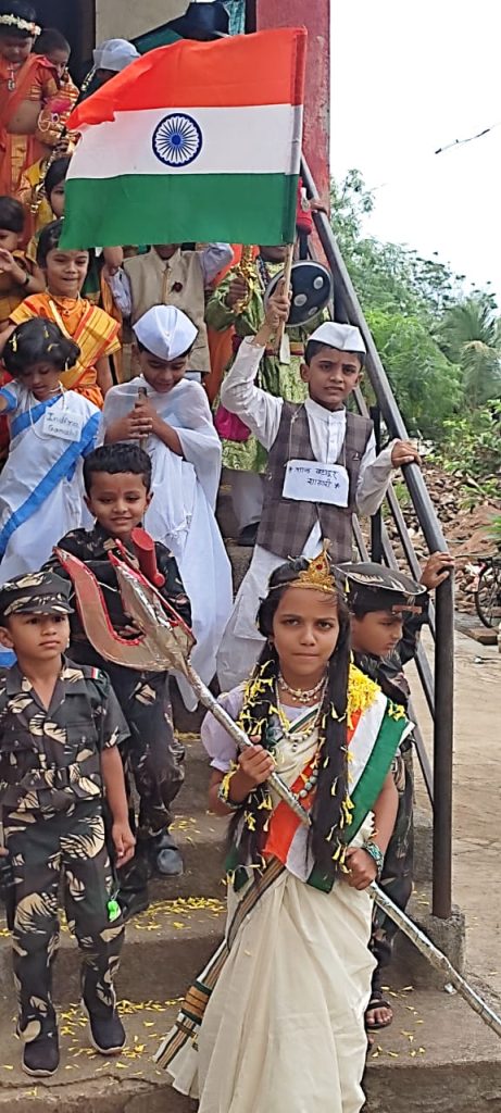 त्या महामानवांच्या वेशभूषेचे अनुक्ररण करून फिनिक्स इंग्लिश स्कूलच्या बालकांनी गावातून रॅली काढून भारत माता की जय,वंन्दे मातरम अशा घोषणा देत क्रांतिदिवस साजरा केला.या वेळी बालकांनी वेगवेगळ्या महामानवांच्या वेशभूषा भारत माता आणि तिचे रक्षणकर्ते सैनिक महात्मा गांधी,डॉ.बाबासाहेब आंबेडकर, पंडित जवाहरलाल नेहरू,सावित्रीबाई फुले,लाल बहाद्दूर शास्त्री छत्रपती शिवाजी महाराज,राजमाता जिजाऊ,झाशीची राणी लक्ष्मीबाई,टिपू सुलतान,भगतसिहं,इंदिरा गांधी,मिसाईल म्यान डॉ.ए.पी.जे अब्दुल कलाम यांचीं वेशभूषा साकारून या देशभक्ताना मानवदंना देऊन त्यांनी केलेल्या त्याग बलिदानाचा आम्हास विसर पडणार नाही अशी देशभक्तीची भावना विद्यार्थ्यांच्या चेहऱ्यावर दिसत होती.