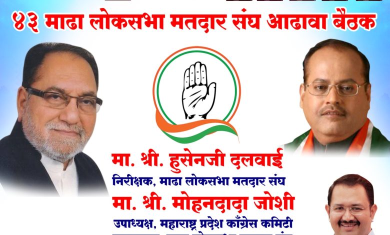 आगामी लोकसभा निवडणुकीच्या पूर्वतयारीसाठी माढा लोकसभा मतदारसंघाचे निरीक्षक खासदार हुसेन दलवाई व महाराष्ट्र प्रदेश काँग्रेस कमिटीचे उपाध्यक्ष,तथा सहनिरीक्षक मोहन जोशी यांच्या प्रमुख उपस्थितीत 43 माढा लोकसभा मतदारसंघातील पदाधिकारी व कार्यकर्त्यांची महत्वाची बैठक रविवार दिनांक १३/८/२०२३ रोजी सकाळी १०:०० वाजता इंदापूर रोड -धवल श्रीराम मंदिर अकलूज ता. माळशिरस जि. सोलापूर. येथे आयोजित करण्यात आले आहे.