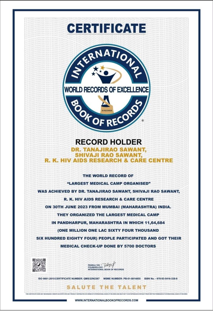 जवळपास 11 लाख 64 हजार रुग्णांची तपासणी करण्यात आली याची दखल जागतिक वर्ल्ड बुकने घेतली असून तसे प्रमाणपत्र आम्हाला दिले आहे