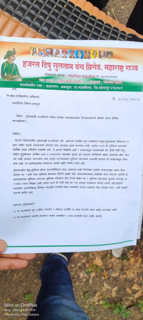 या घटनेच्या निषेधार्थ समस्त मुस्लिम समाजाच्या भावना दुखावल्या गेल्या याच अनुषंगाने पुसेसावळी घटनेच्या निषेधार्थ अकलूज पंचक्रोशितील बहुसंख्य मुस्लिम समाजाच्या वतीने या घटनेचा निषेध म्हणून पुसेसावळी ता. कोरेगांव येथील दंगेखोर समाज कंटकांवर निःपक्ष पणे चौकशी करून दोषींवर कारवाई करून या मागील मास्टरमाईंड कोन? याचा शोध घेण्यात यावा,या बाबत चे निवेदन उपविभागीय दंडाधिकारी (प्रांत) कार्यालयाला देण्यात आले.या वेळी अकलूज पंचक्रोशितील बहुसंख्य मुस्लिम समाज बांधव उपस्थित होते…