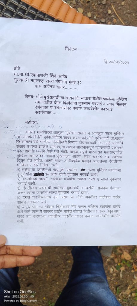 पुसेसावळीत हिंदु-मुस्लिम बांधव गुण्यागोविंदाने नांदत असताना काही विध्वंसक वृत्तीस सरकारकडून अभय दिला जातोय का ? अशी शंका मुस्लिम बांधवांना निर्माण झाली आहे.समाजमाध्यमात आक्षेपार्ह पोस्ट करणारा आरोपी हा अल्पसंख्याक मुस्लिम नसताना मुस्लिम बांधवाचा जीव घेणारे मोकट का ? मुस्लिम समाजाला दुय्यम वागणूक का ? त्यांना न्याय मिळेल अशी अपेक्षा करणे ही व्यर्थ आहे का ? हा आमचा सरकारला संतप्त सवाल आहे.सदरील घटनेतील आरोपींविरुद्ध निष्पक्ष पध्दतीने कारवाई करून यामागील मास्टर माइंडचा शोध घेण्यात यावा,अशी आम्ही मागणी करीत आहे…