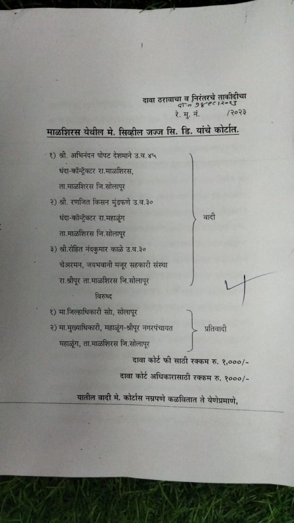 या विरोधात अपात्र केलेल्या ठेकेदारांनी जिल्हाधिकारी व मुख्याधिकारी यांच्या विरोधात न्यायालयात धाव घेऊन न्याया व हक्कासाठी दावा दाखल केला आहे . त्यामध्ये सदरची कृत्य बेकायदेशीर ठरवून निविदा नोटीसला स्थगिती मिळावी असा दावा अपात्र ठेकेदारांपैकी १) अभिनंदन पोपट देशमाने माळशिरस, २) रणजित किसन मुंडफणे महाळुंग ,३) रोहित नंदकुमार काळे श्रीपुर, यांनी दिनांक १८ /०९/२०२३ रोजी दाखल केला आहे.