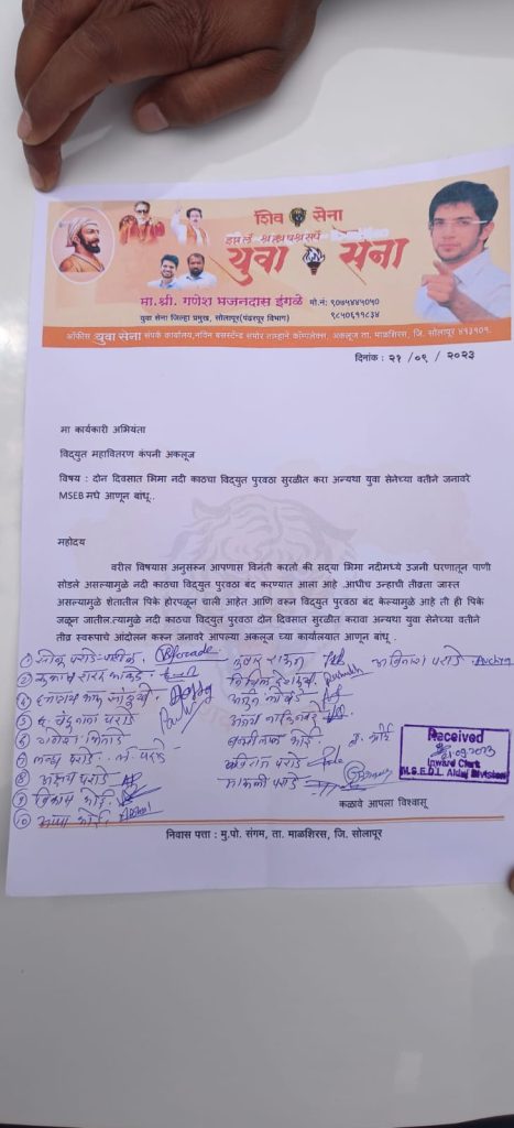 भीमा नदीकाठचा विद्युत प्रवाह सुरळीत करा युवा सेनेची मागणी. अन्यथा जनावरे अकलूजच्या महावितरण कंपनीमध्ये बांधू युवा सेना प्रमुख – गणेश इंगळे