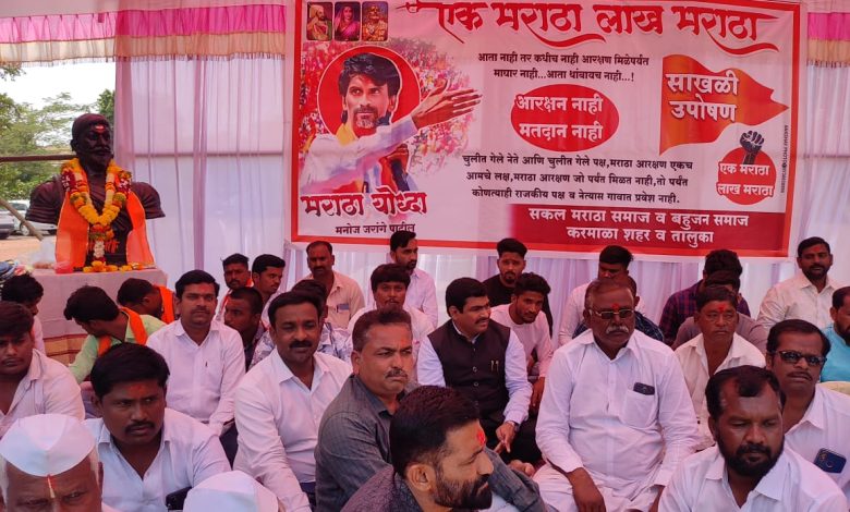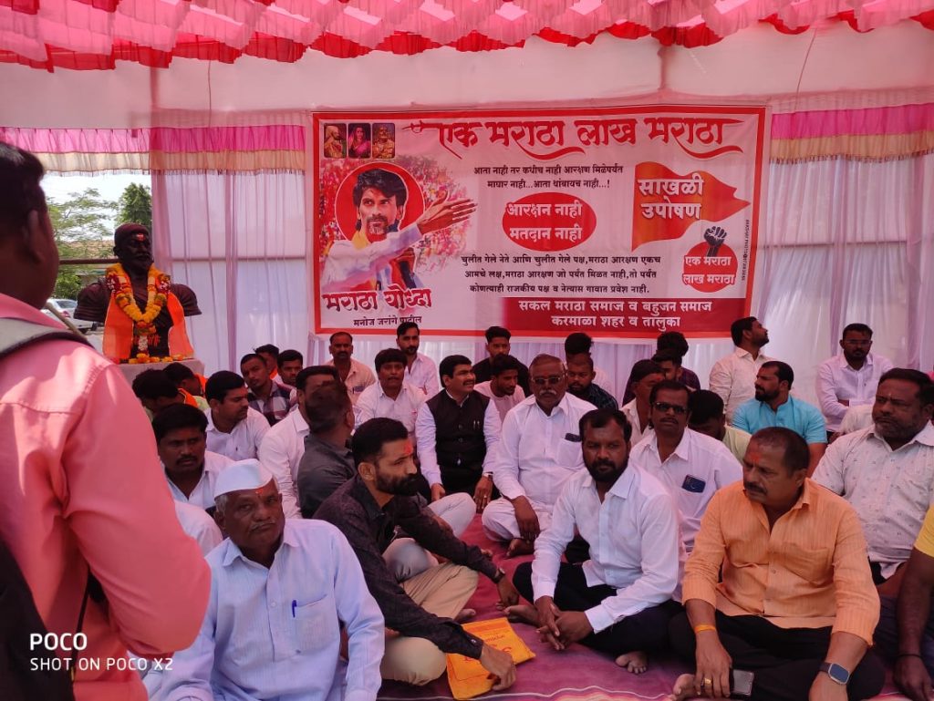 मराठा समाजाची परिस्थिती आरक्षण नसल्यामुळे अत्यंत बिकट झाली असून, या समाजाच्या प्रगतीसाठी आरक्षण मिळणे ही काळाची गरज आहे. मराठा योद्धा मनोज जरांगे यांच्या आरक्षणाच्या भूमिकेला पाठिंबा देण्यासाठी सकल मराठा समाज करमाळा यांच्यावतीने दिनांक २६ ऑक्टोबर रोजीपासुन करमाळा तहसील येथे सकाळी १०:०० वाजल्यापासून चक्री उपोषण सुरू केले असून, दत्तकला शिक्षण संस्थेचे अध्यक्ष प्रा.रामदास झोळ यांनी नायब तहसीलदार गायकवाड साहेब, पोलीस निरीक्षक ज्योतीराम गुंजवटे साहेब यांना २७ ॲाक्टोंबर रोजी चक्री उपोषण करणार असल्याचे निवेदन दिले होते.