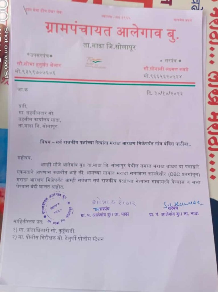 या गोष्टीला स्थानिक ग्रामपंचायतीने त्यांना गाव बंदी असताना कोणत्याही प्रकारचा विरोध केला नाही. सावंत बंधूनी मराठा आरक्षणाबाबत आपली कोणतीही ठोस भूमिका घेतली नाही. उलट आलेगाव बुद्रुक मधील ग्रामपंचायतीने पुढाऱ्यांना गावबंदी केली असताना सावंतने कोणाला विचारून हा सोहळा पार पडला याचे उत्तर आलेगाव बुद्रुक ग्रामस्थांना मिळेल काय?