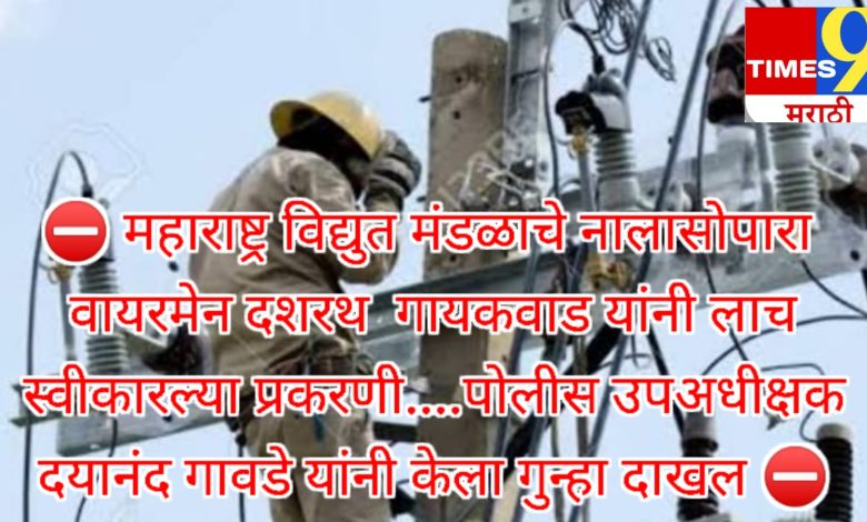 महाराष्ट्र विद्युत मंडळ नालासोपारा वायरमन दशरथ गायकवाड यांच्या विरुद्ध लाच स्वीकारल्या प्रकरणी पोलीस उपअधीक्षक दयानंद गावडे यांनी पेल्हार पोलीस ठाण्यात केला गुन्हा दाखल