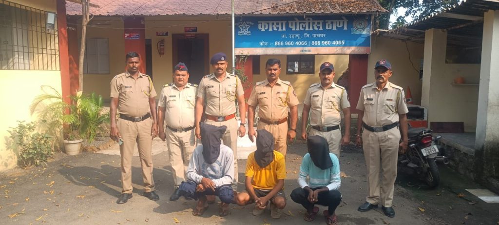 या आदेशाची अंमलबजावणी करून अवघ्या तीन दिवसात या गुन्ह्यातील आरोपी वसीम अब्दुल हमीद अन्सारी वय वर्ष (21), समीर अन्सार खान वय वर्ष (18 ),आदिल ताज मोहम्मद शेख वय वर्ष(19) राहणार डहाणू सावटा-दुबलापाडा या तिघांना मुद्देमालासह बुधवार दिनांक 8 नोव्हेंबर 2023 रोजी कासा पोलीस ठाणे प्रभारी पोलीस निरीक्षक नामदेव बंडगर, पोलीस उपनिरीक्षक संदीप नांगरे, पोलीस हवालदार बी.आर. धांगडा, सह कासा पोलीस ठाणे अंमलदार या पथकाने अटक करून या तिघांविरुद्ध कासा पोलीस ठाण्यात बुधवारी गुन्हा नोंद करून त्यांना जेरबंद केले आहे. या गुन्ह्याबाबत अधिक तपास कासा पोलीस ठाणे पोलीस निरीक्षक नामदेव बंडगर यांच्या मार्गदर्शनाखाली पोलीस उपनिरीक्षक संदीप नांगरे करत आहेत.