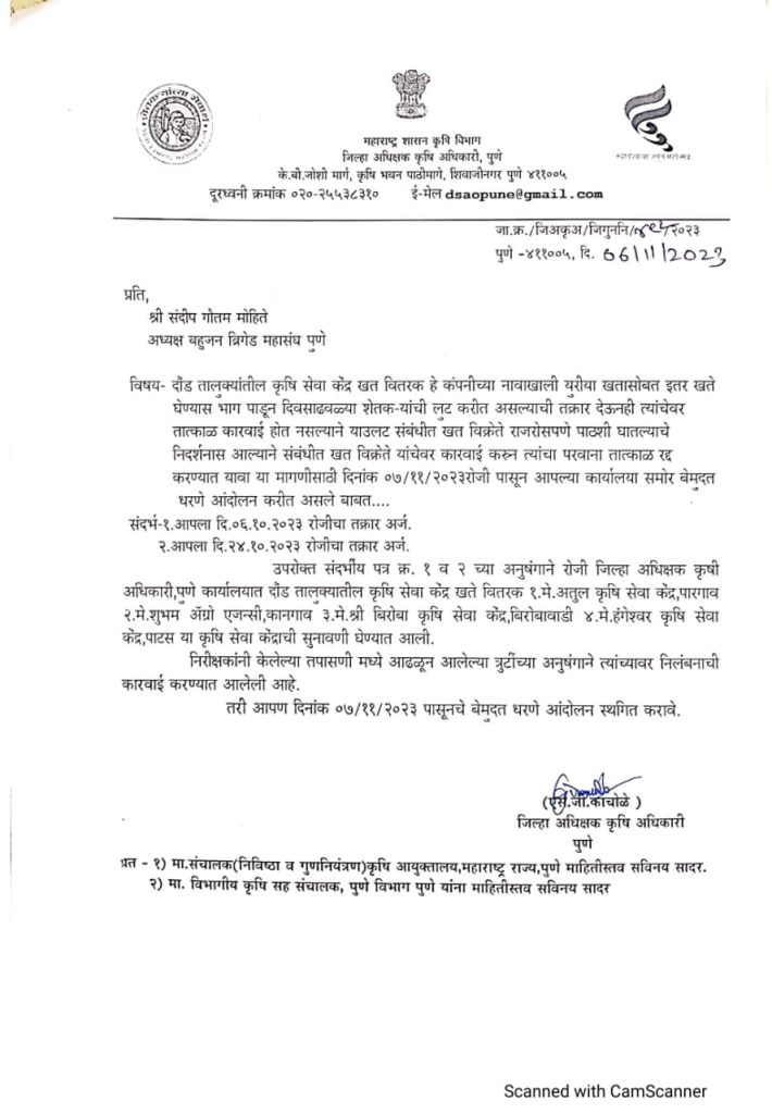 दौंड तालुक्यातील खत विक्रेते कृषी सेवा केंद्र व रासायनिक खते वितरक यांनी कंपनीच्या नावाखाली शेतकऱ्यांना युरिया खता सोबत इतर लिंकिंगची खते घेण्यास भाग पाडून शेतकऱ्यांची दिवसाढवळ्या लूट करीत असल्याने व शेतकऱ्यांचे आर्थिक पिळवणूक होत असल्याची तक्रार बहुजन ब्रिगेड महासंघाच्या वतीने दिनांक 6 ऑक्टोबर 2023 रोजी जिल्हा कृषी अधीक्षक कार्यालय पुणे यांना तक्रार देण्यात आली होती.