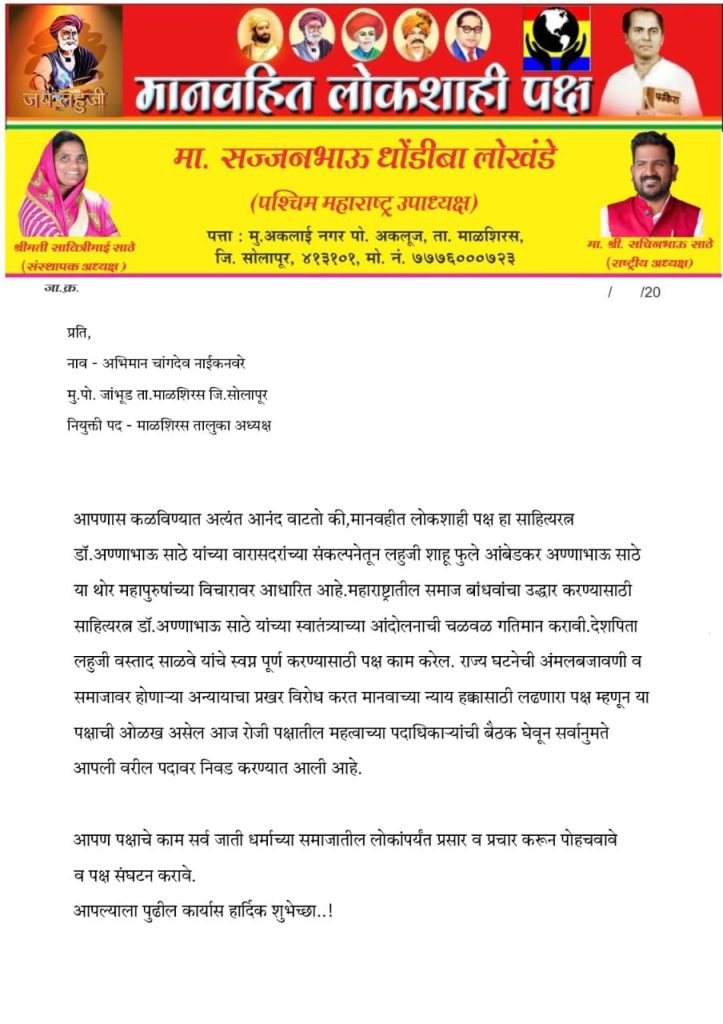 राज्यघटनेची अंमलबजावणी व समाजावर होणाऱ्या अन्यायाचा प्रखर विरोध करत मानवाच्या न्याय हक्कासाठी सदैव तत्पर असणारा पक्ष म्हणून या पक्षाची ओळख आहे. बहुजन समाजातील मागासलेपणा दूर करण्यासाठी सामाजिक, शैक्षणिक व आर्थिक प्रगतीसाठी सतत कार्यरत असणारा पक्ष मानवहित लोकशाही पक्ष यालाच अनुसरून अभिमान नाईकनवरे यांचे सामाजिक क्षेत्रातील योगदान, गुणवत्ता व कार्यक्षमता त्यांची सोलापूर जिल्ह्यात असणारे अनेक हितसंबंध अनेकांशी अगदी मनमोकळ्यापणाचे बोलणे त्यांच्याशी असणारे अनेकांची जवळीक व त्यांचा जनसंपर्क पाहता याचा भविष्यात मानवीत लोकशाही पक्षाला होणारा फायदा याच उद्देशाने मानवीत लोकशाही पक्षाचे पश्चिम महाराष्ट्र उपाध्यक्ष सज्जन भाऊ लोखंडे यांनी अकलूज येथील शासकीय विश्रामगृह येथे पक्षातील महत्त्वाच्या पदाधिकाऱ्यांची बैठक घेऊन सर्वानुमते माळशिरस तालुका अध्यक्षपदी अभिमान चांगदेव नाईक नवरे यांची निवड केली व त्यांना पक्षाचे काम सर्व जाती-धर्माच्या समाजातील लोकांपर्यंत प्रसार व प्रचार करून पोहोचवावे व पक्ष संघटन करावे अशा शुभेच्छा देण्यात आल्या.