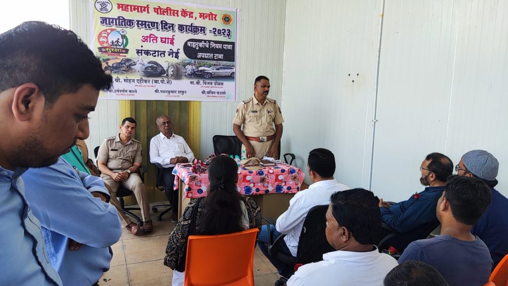 रस्ते अपघातातील पीडित व्यक्तीच्या स्मरणार्थ 19 नोव्हेंबर ते 24 नोव्हेंबर हा “जागतिक स्मरण दिन” सप्ताह पाळला जातो या अनुषंगाने महामार्ग पोलीस केंद्र मनोर येथे रस्ते अपघातामधील मयत व्यक्तींच्या स्मरणार्थ 2 मिनिटे उभे राहून मौन पाळून आदरांजली वाहण्यात आली. या दरम्यान महामार्ग पोलीस केंद्र मनोर येथे 3 अपघात ग्रस्त पीडितांचे नातेवाईक व 44 मृत्यंजय दुत उपस्थित होते. यावेळी वाहतूक नियामबाबतचे नियमित पालन कारणेबाबत सर्वांनी मिळून शपथ घेतली.