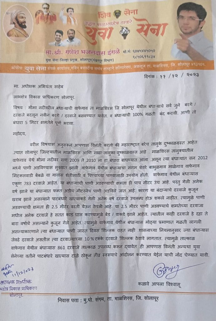 शिवसेना युवा सेना सचिव वरून सरदेसाई युवा सेना विभागीय सचिव अक्षय ढोबळे यांच्या मार्गदर्शनाखाली युवा सेना सोलापूर जिल्हा संपर्क प्रमुख उत्तम आयवळे यांच्या आदेशाने पाटबंधारे खात्याचे AC साळी साहेब यांना युवा सेना जिल्हाप्रमुख गणेश इंगळे यांच्या वतीने निवेदन देण्यात आले .